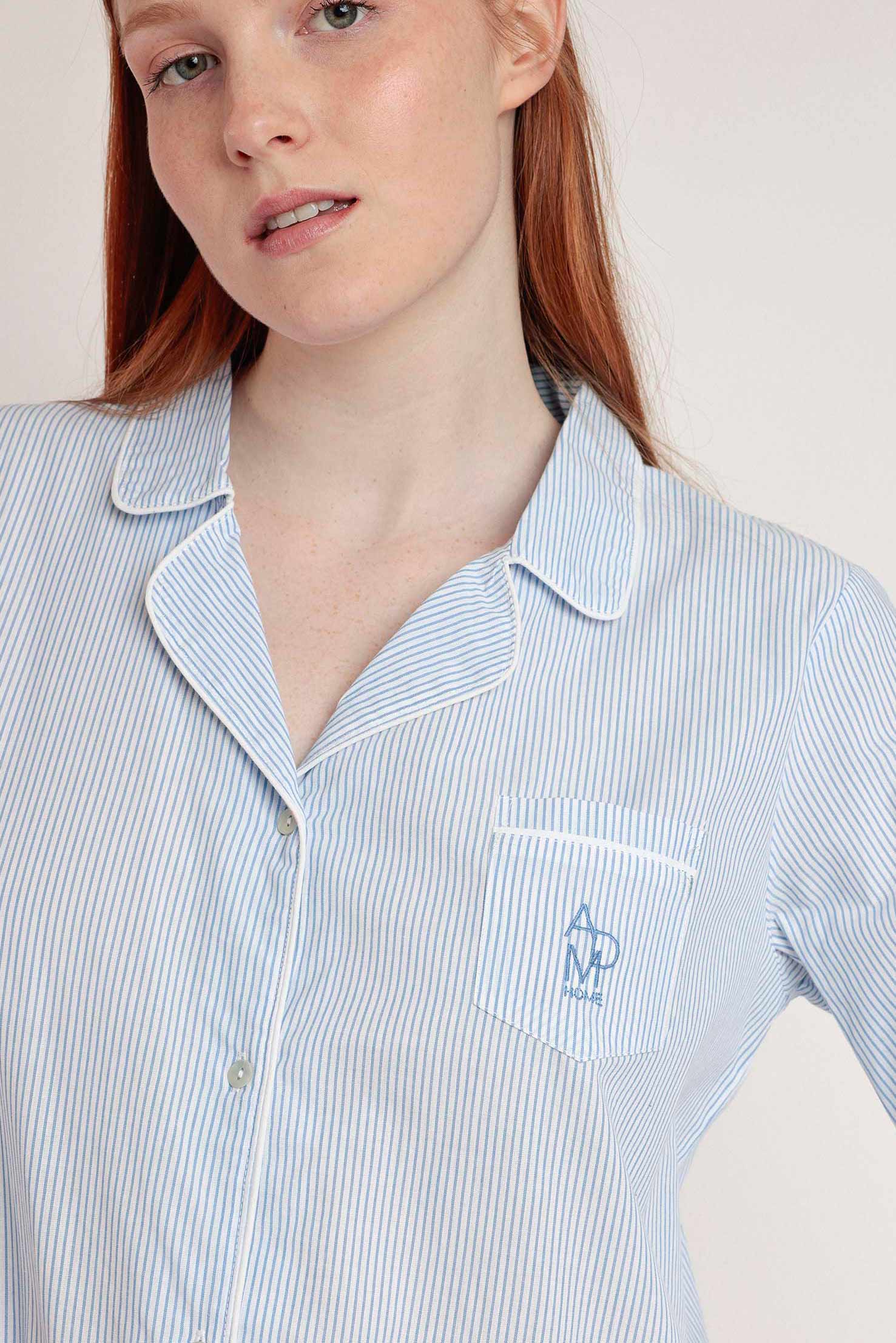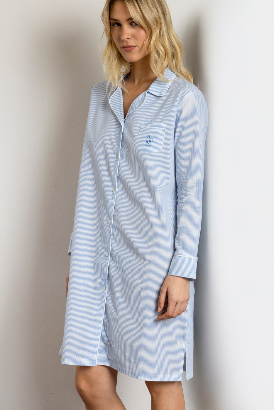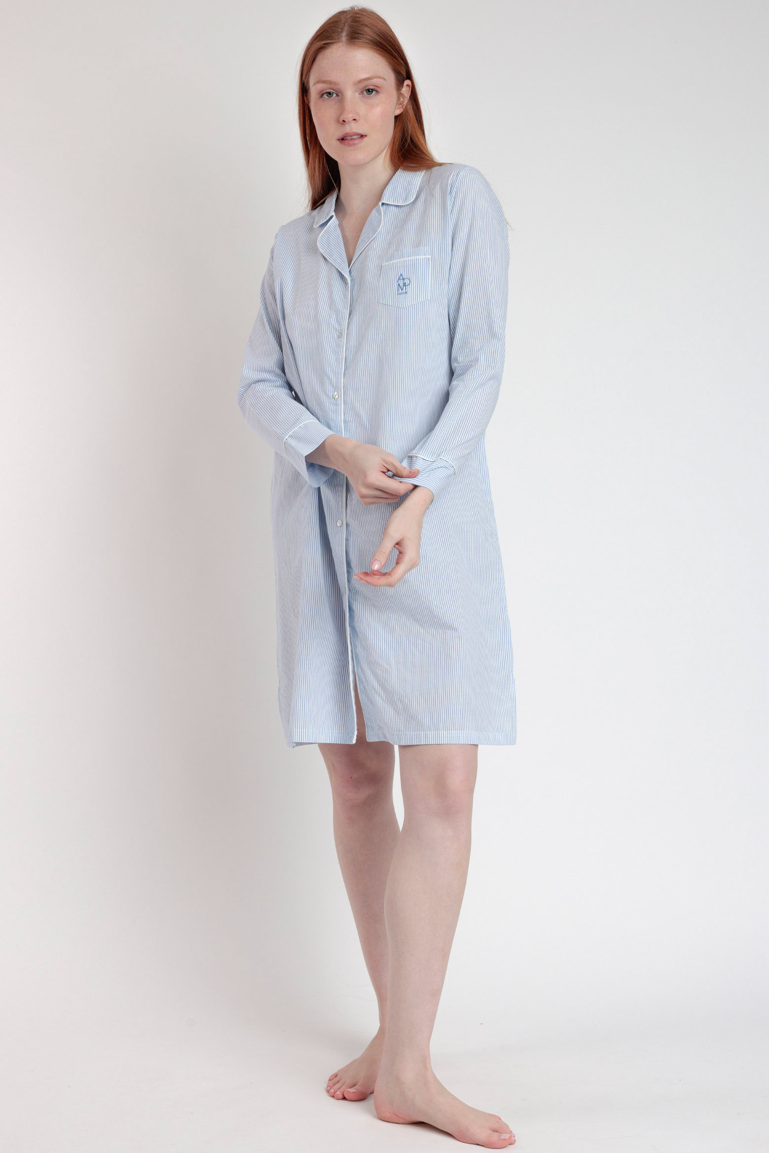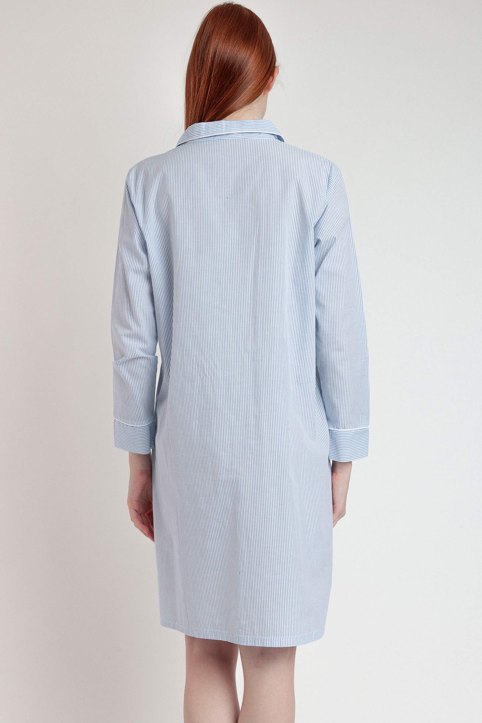 Женская удлиненная рубашка светло-голубого цвета в полоску.