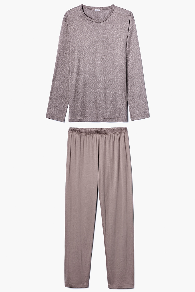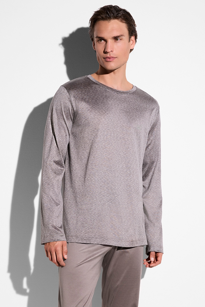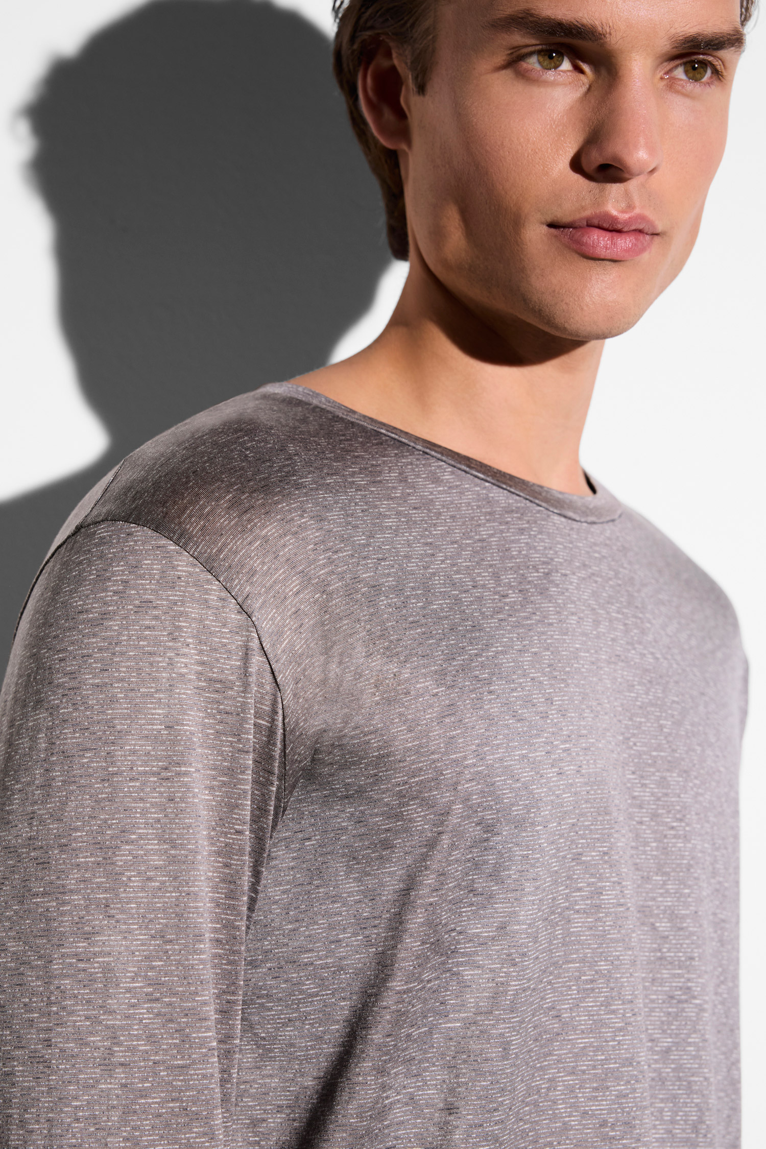 Майка с длинным рукавом сделана с жаккардовым плетением в меланжевую коричневую полоску и состоит из 32% шелка и 68% хлопка.