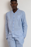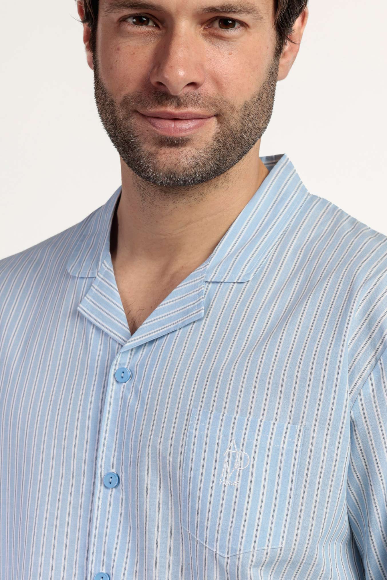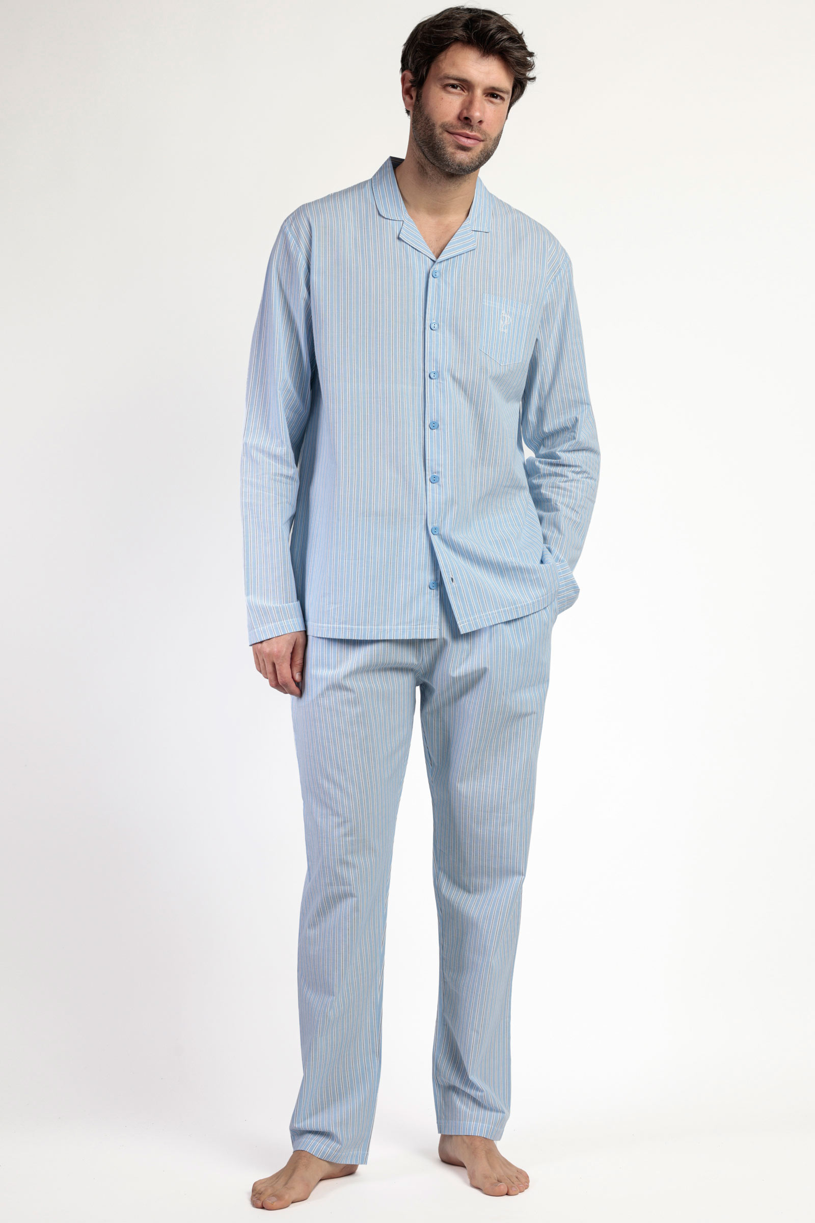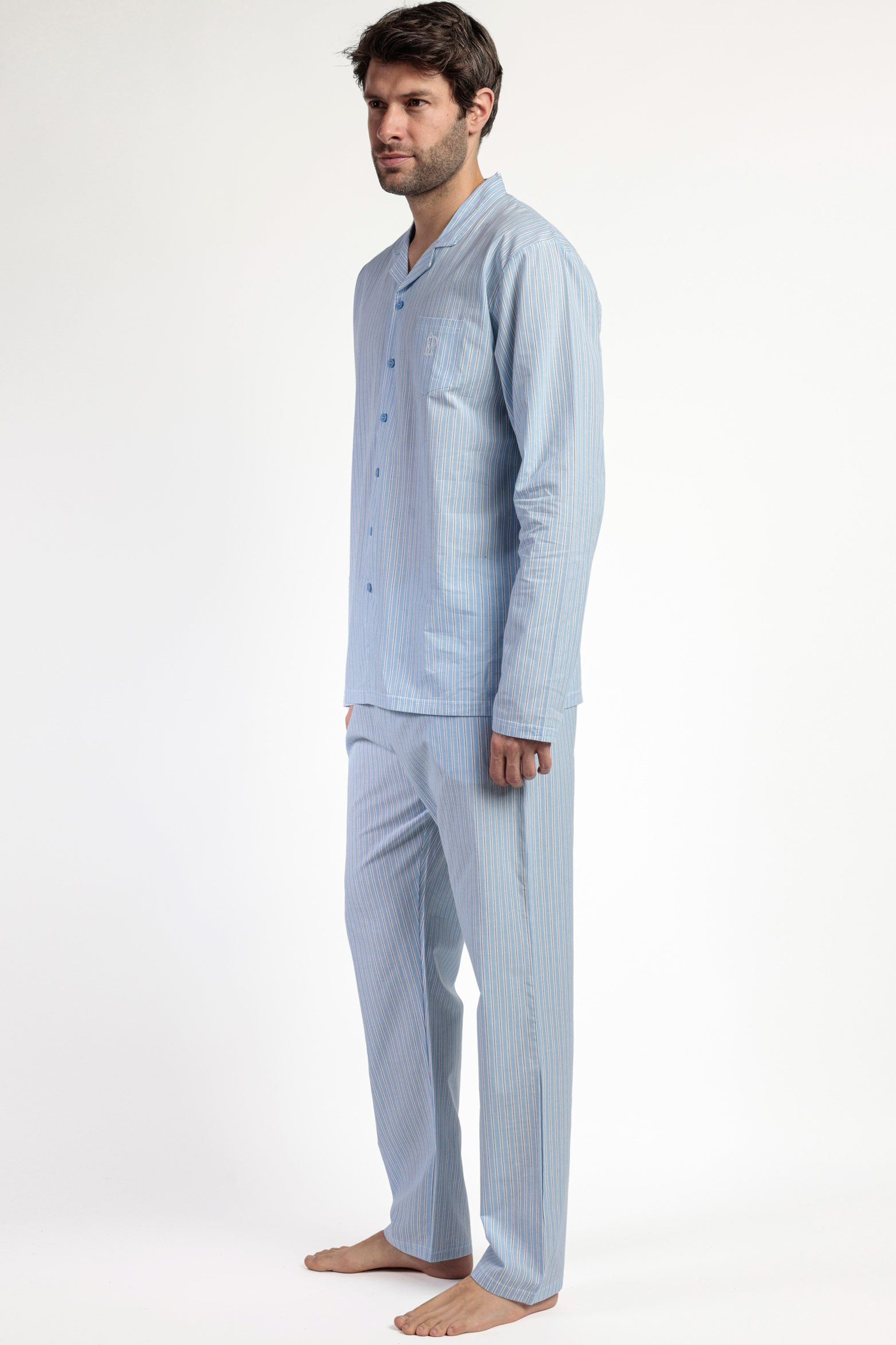 Классическая мужская пижама голубого цвета в полоску.