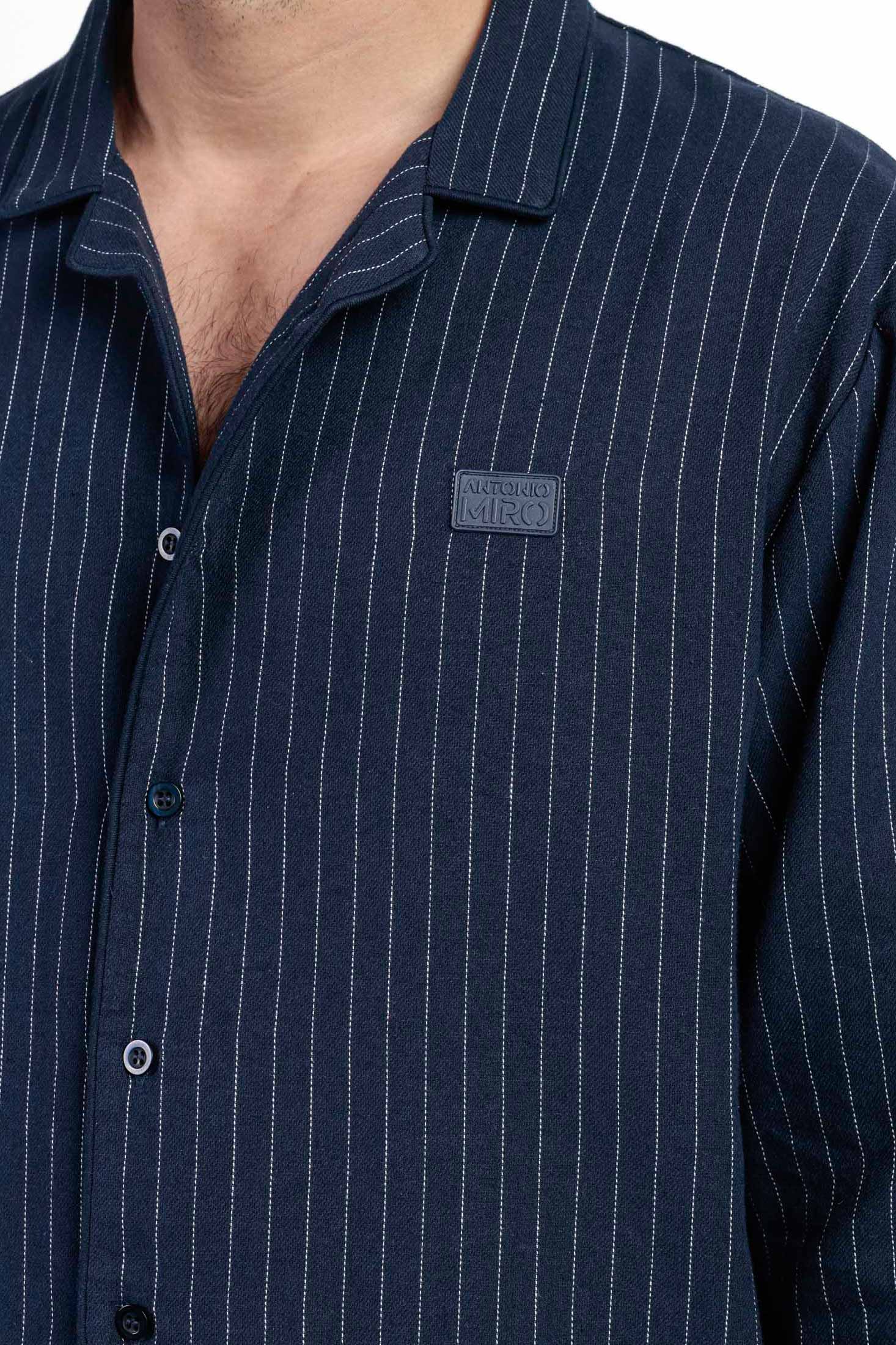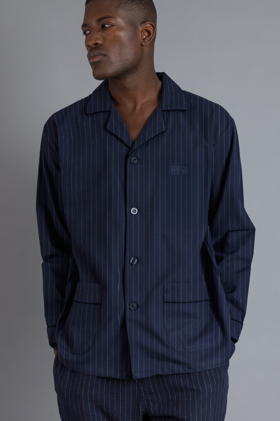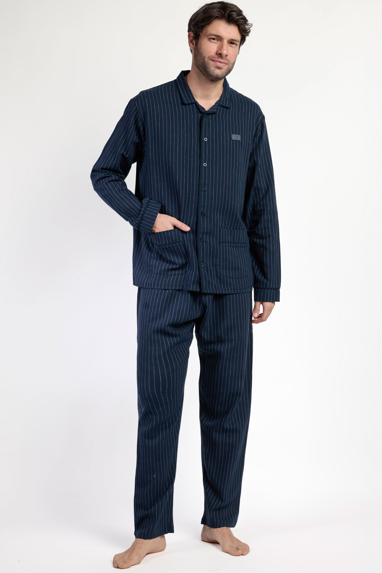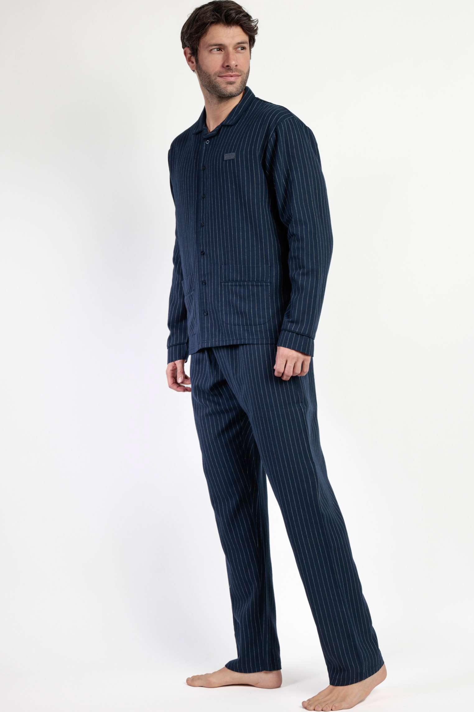 Мужская пижама темно-синего цвета в тонкую полоску.
