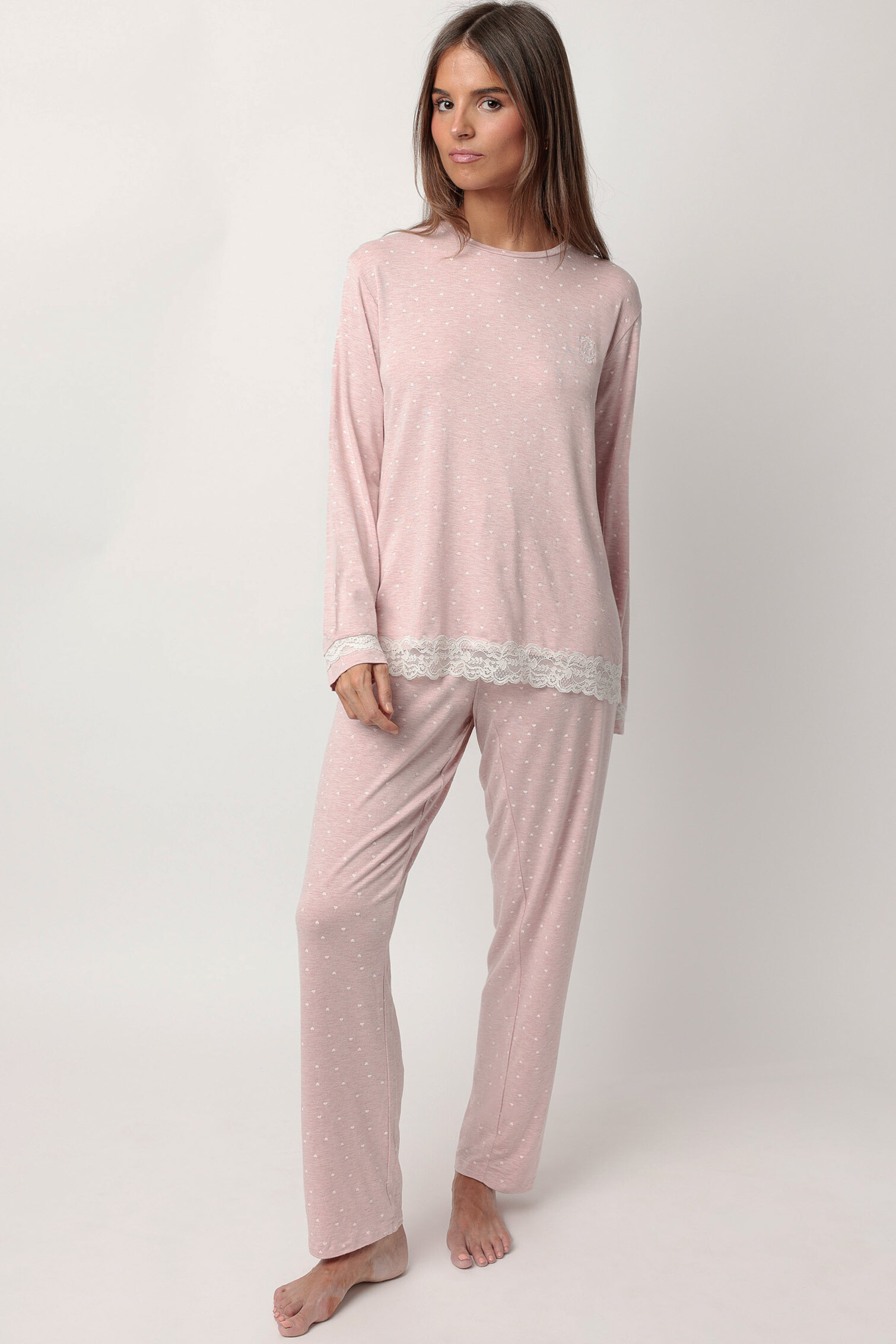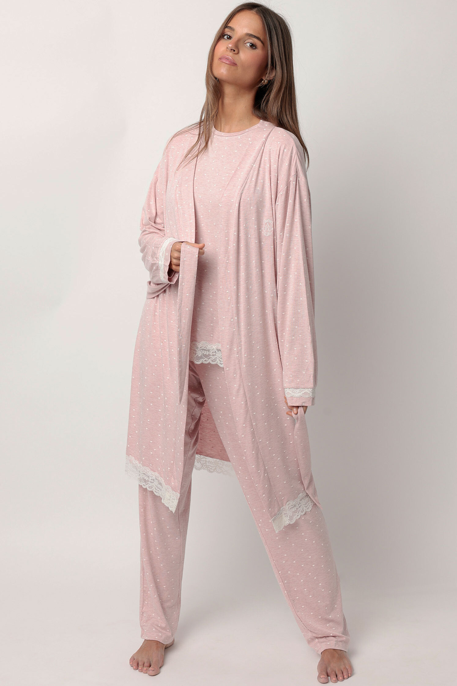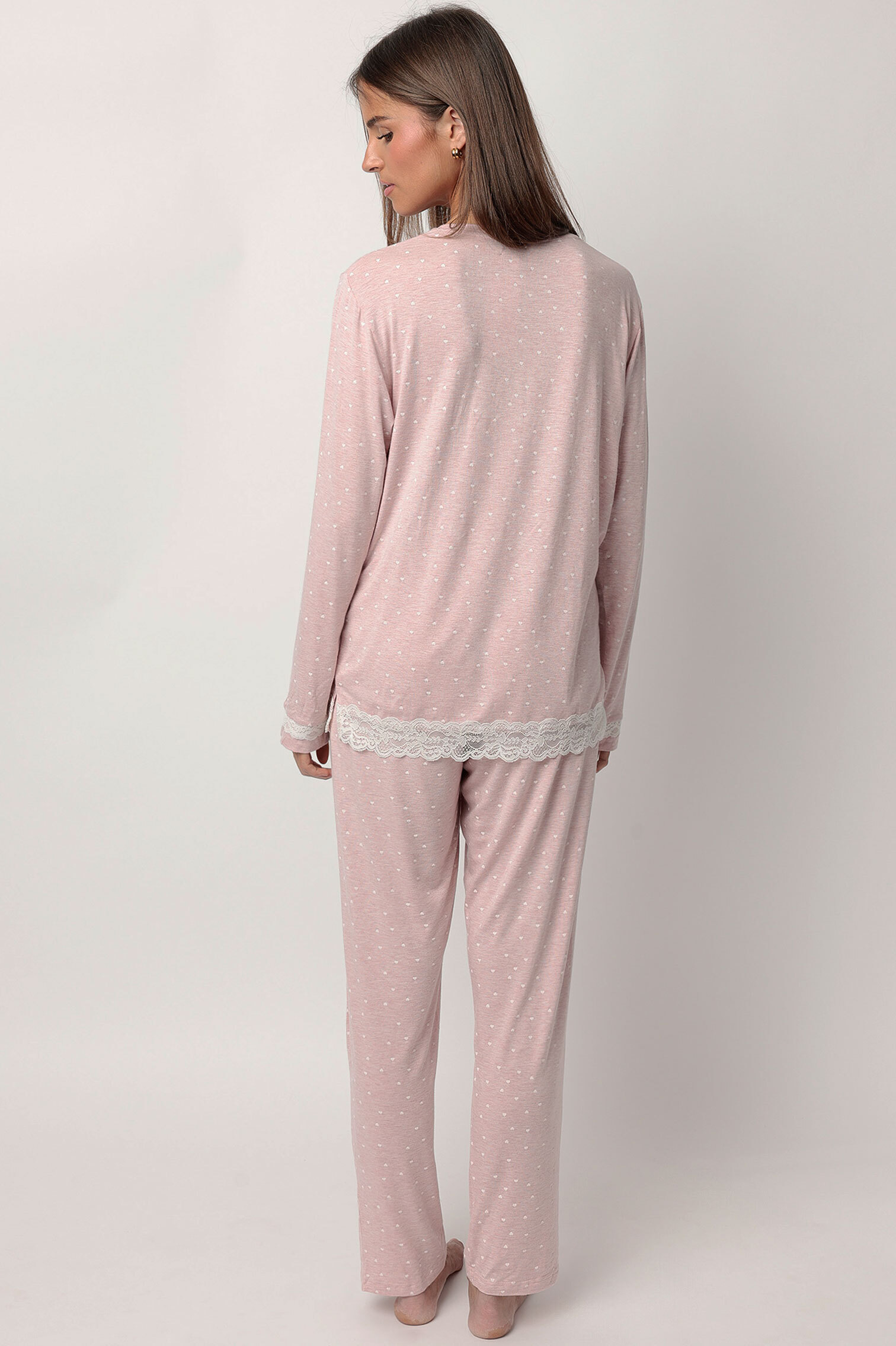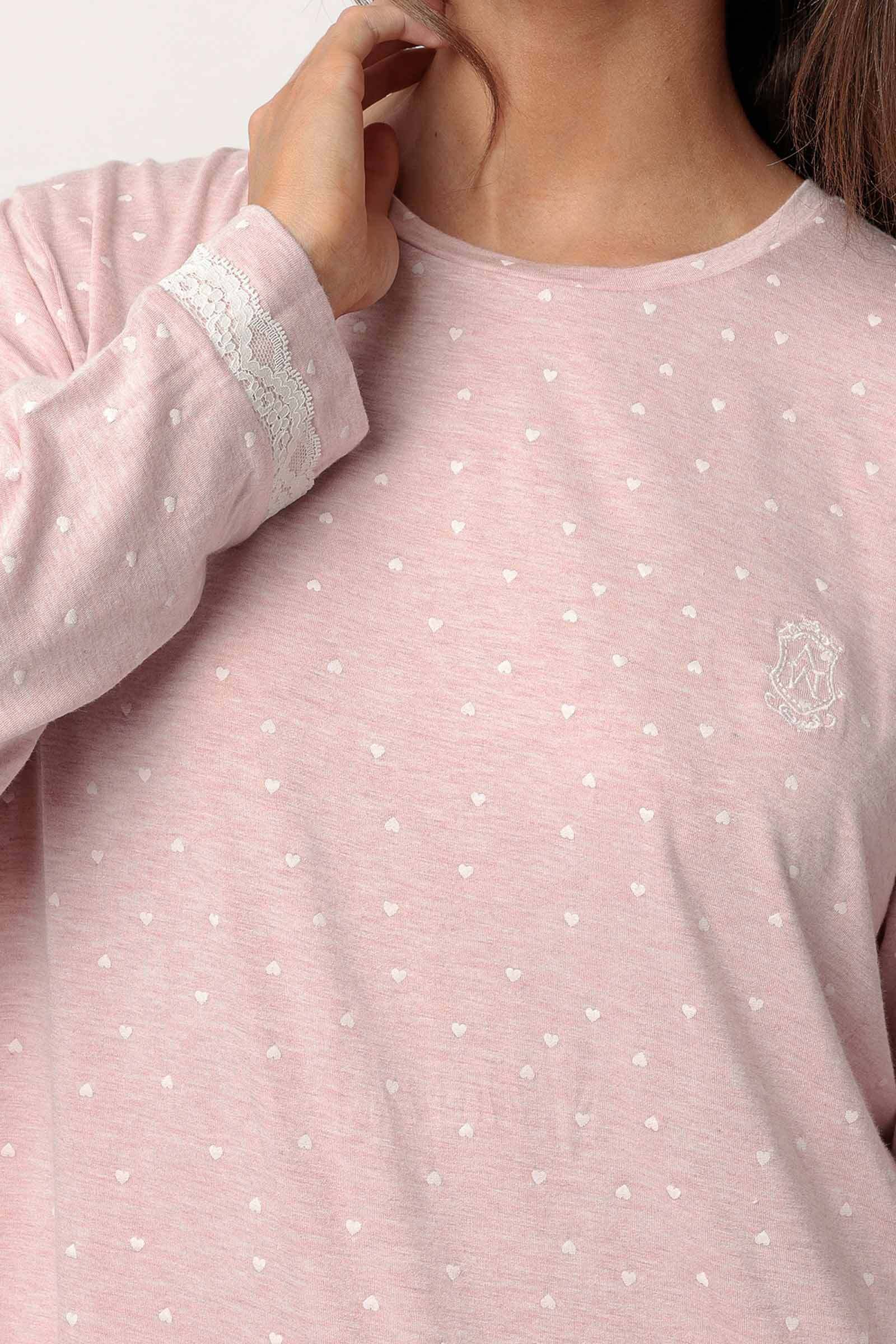 Готовый домашний образ с нежным принтом в пастельно-розовом цвете.
