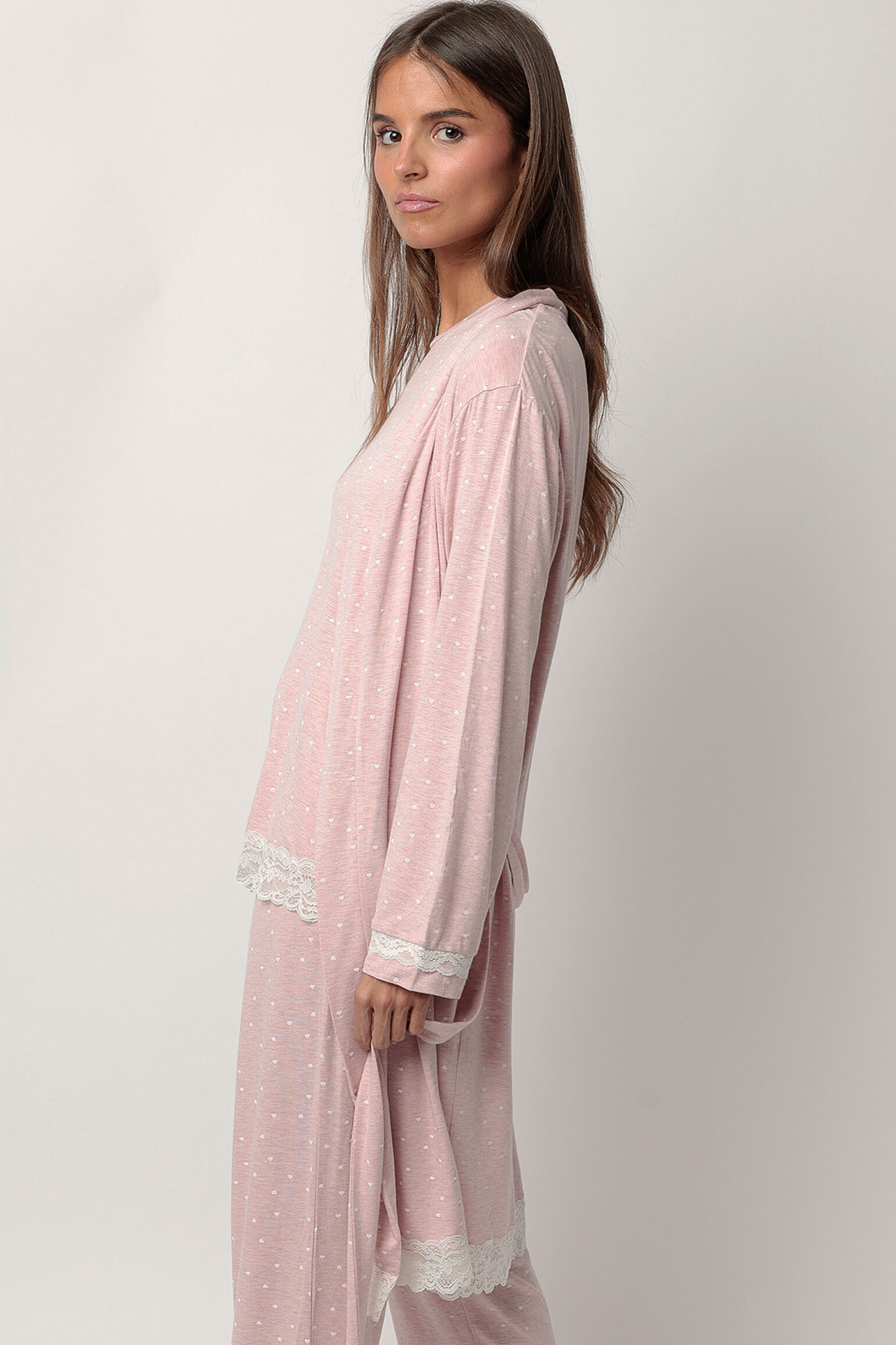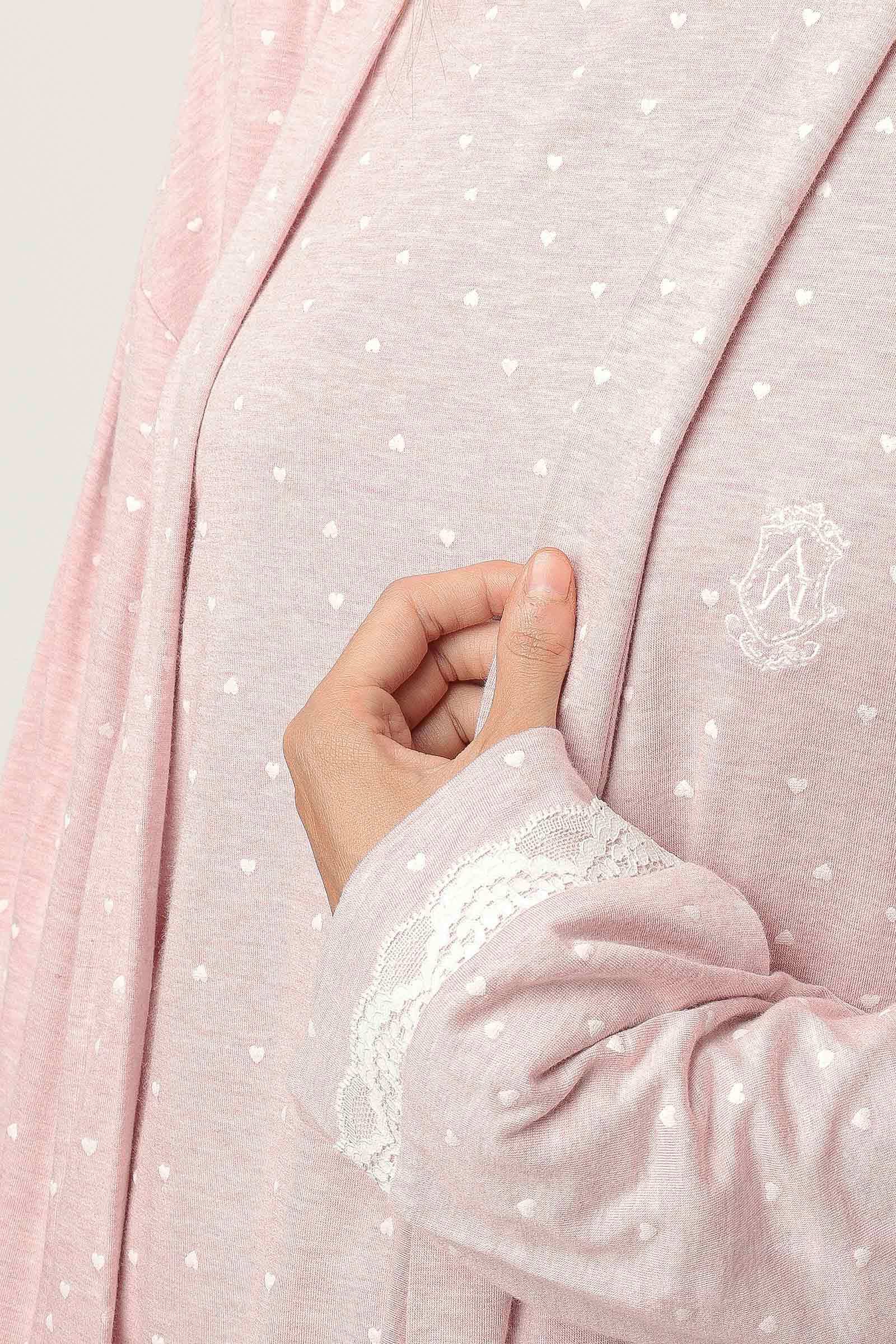 Выполнен в нежном розовом оттенке с мелким узором - сердечки.